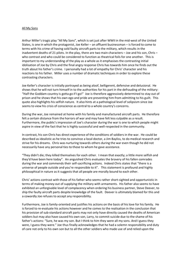 All My Sons literature essays are academic essays for citation. These papers were written primarily by students and provide critical analysis of All My Sons. Best summary PDF, themes, and quotes Analytical Essay Sample on the Story "All My Sons" by Arthur Miller. In the story All My Sons by Arthur Miller, there are many symbols that influence the characters’ actions and other events. Symbols such as the tree in the yard and the date November 25th represent the remembrance of Larry Keller Introduction Arthur Miller's 'All My Sons' is a play that explores the secrets and hidden guilt that surrounds an average American family after the Second World War. The conflict in the text lies between the two main characters, Joe (the father) and Chris (the son). The conflict arises because of Joe's actions and the difference between Joe's isolationist personality and ideals and Chris's idealistic personality Estimated Reading Time: 7 mins